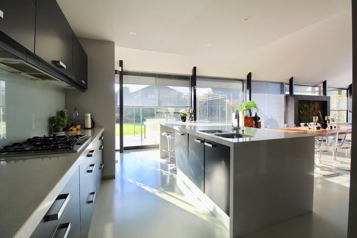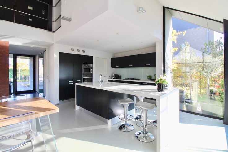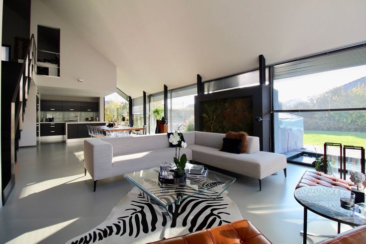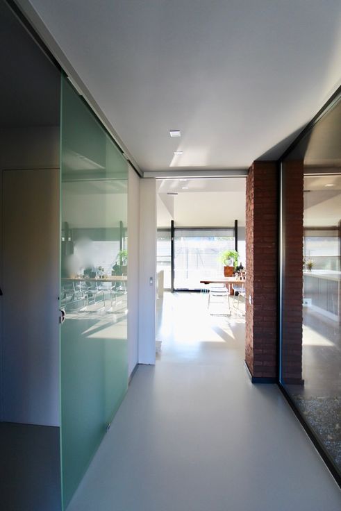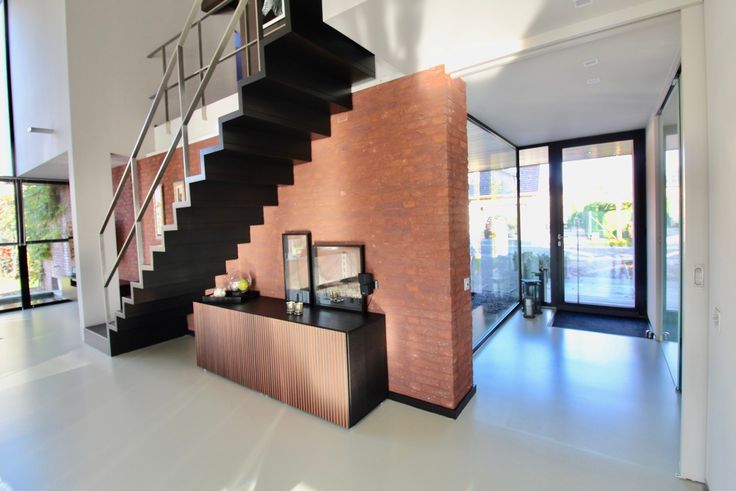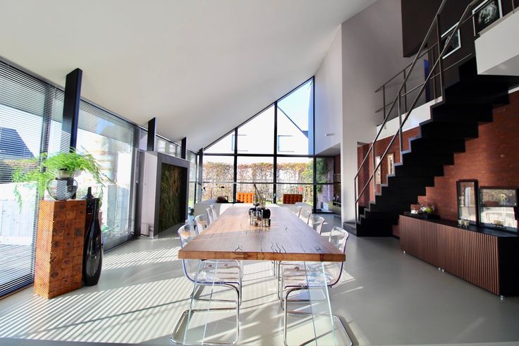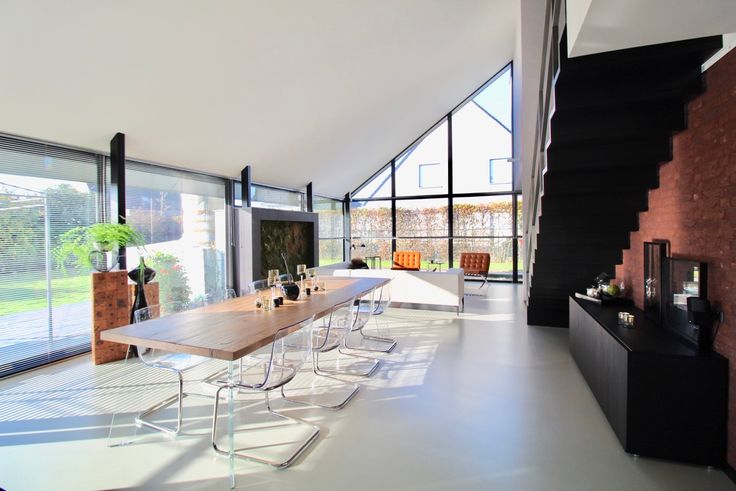 Indeling: hall met vestiaire, gastentoilet. Door de schuifwand kom je terecht in de lichtrijke leefruimte met open keuken met keukeneiland en de zithoek. De strakke polybeton vloer zorgt voor de moderne en toch warme sfeer in de woning.