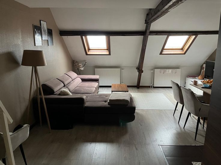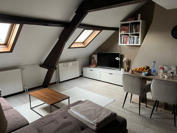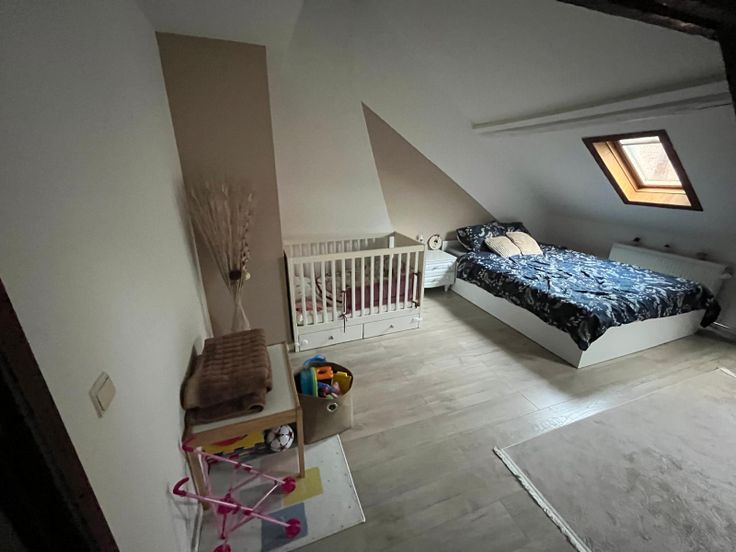 L'appartement d'une superficie de +- 80 m2 dispose d'un hall d'entrée, d'un séjour avec cuisine ouverte super équipée (lave-vaisselle, frigo/congélateur et micro-onde inclus), d'une salle de bain, d'une grande chambre parentale et de deux pièces en enfilade de +- 10m2 chacune à l'étage supérieur.