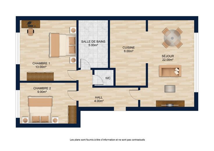 Ce logement offre 60m2 habitables: Séjour avec cuisine semi-équipée, 2 chambres, salle de bain, WC indépendant.