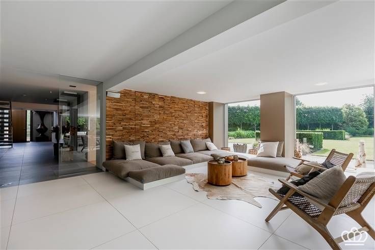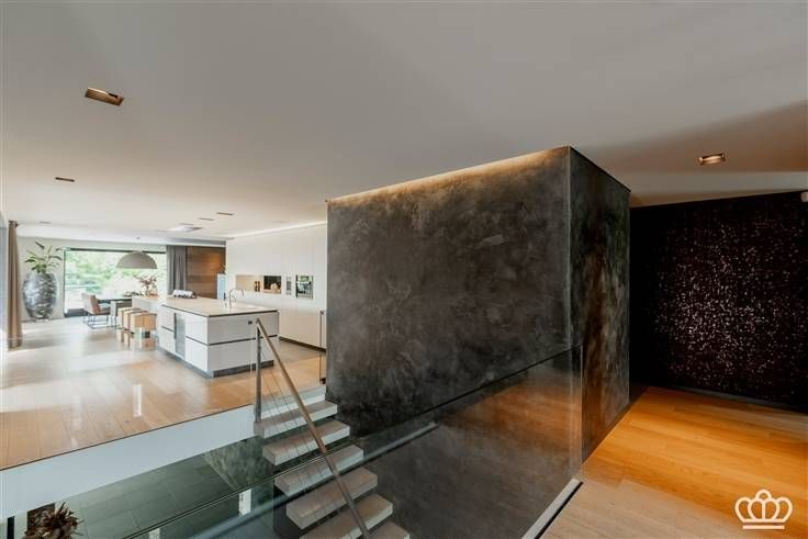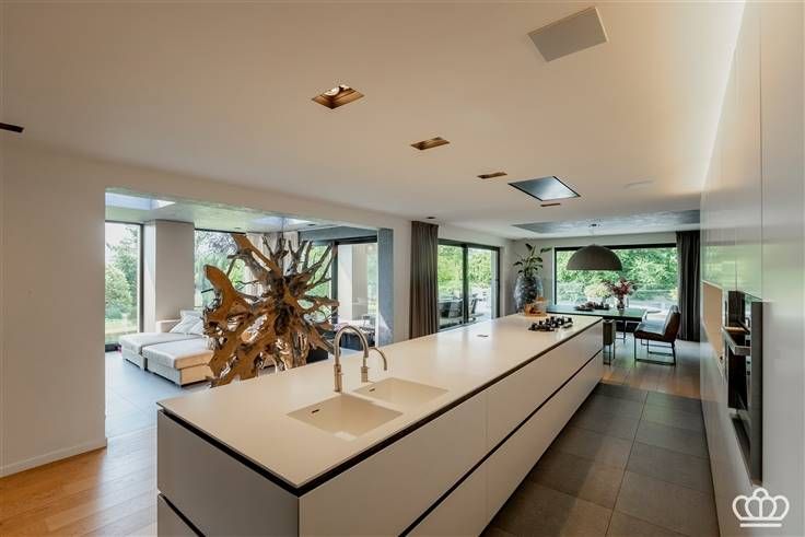 Moderne keuken, leefruimte met doorkijkhaard, eet- en zithoek, tuinkamer, bijkeuken, masterunit met slaapkamer, dressing en luxe badkamer. 3 slaapkamers, 2e badkamer.