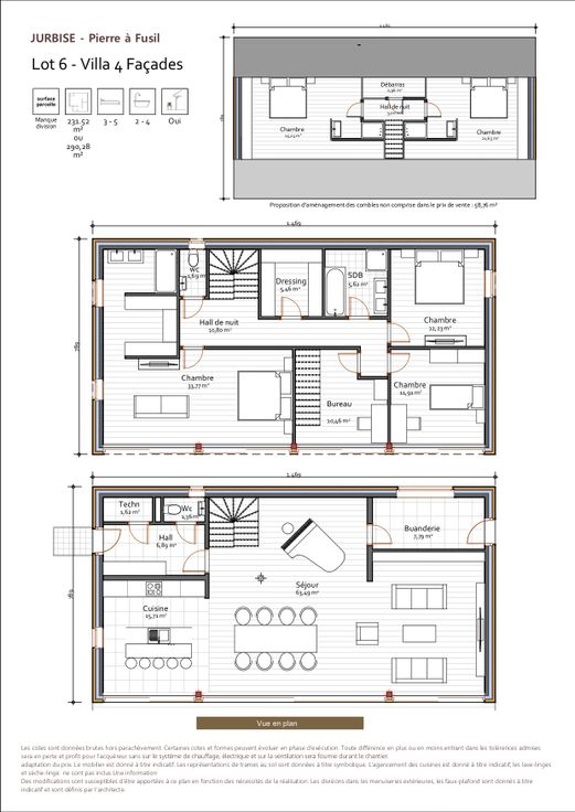 Compose de cinq chambres, un bureau, deux toilettes, quatre salles de bain, buanderie et un séjour-cuisine de 80 m².