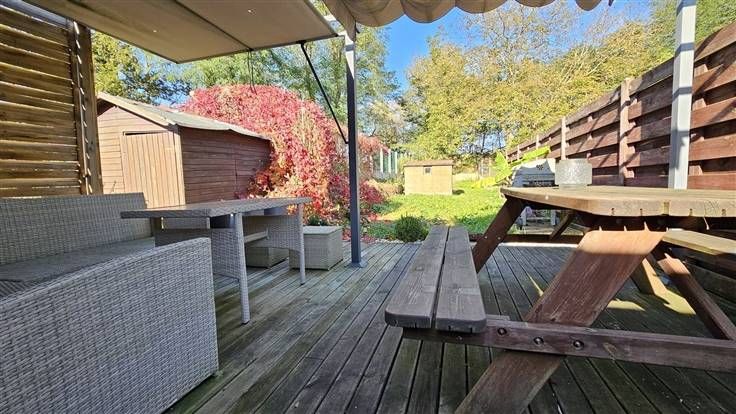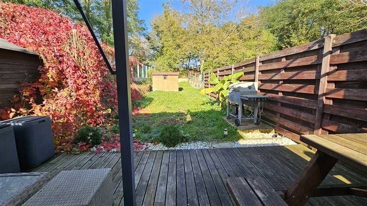 Rez: Salon, salle à manger, cuisine équipée, grand dégagement pouvant servir de bureau, salle de douche, terrasse, jardin, garage en face de la maison.