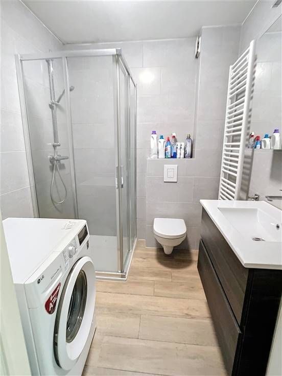 Recent vernieuwde badkamer met douche, lavabo en toilet