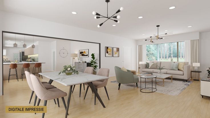 De grote leefruimte en eetkamer genieten erg veel lichtinval door de talrijke ramen. De parketvloer en de houthaard zorgen voor dat tikkeltje extra. Aansluitend is er de keuken. Zoals te zien is op onze digitale renovatie, zijn er veel mogelijkheden met deze ruimtes.