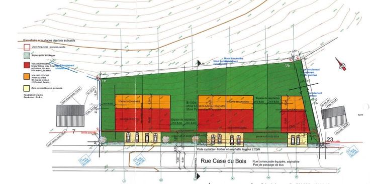 Les zones de recul latérales non aedificandi (non bâtissables) sont de minimum 3 mètres et la zone de recul avant est de 6 à 8 mètres. Le volume principal doit avoir une largeur entre 5,5 et 10 mètres, la profondeur sera de maximum 10 mètres. La hauteur sous corniche se situera entre 3,5 et 6 mètres. Il est possible de construire un volume secondaire arrière ou latéral de maximum 6 mètres de profondeur avec une hauteur sous corniche entre 2,8 et 4 mètres.
