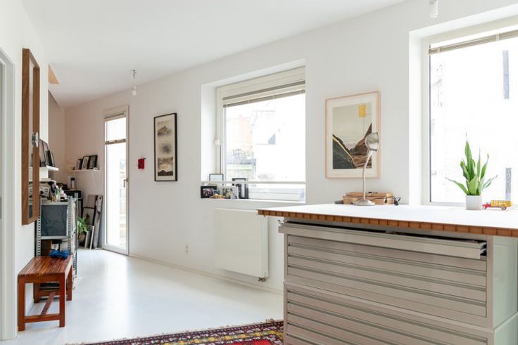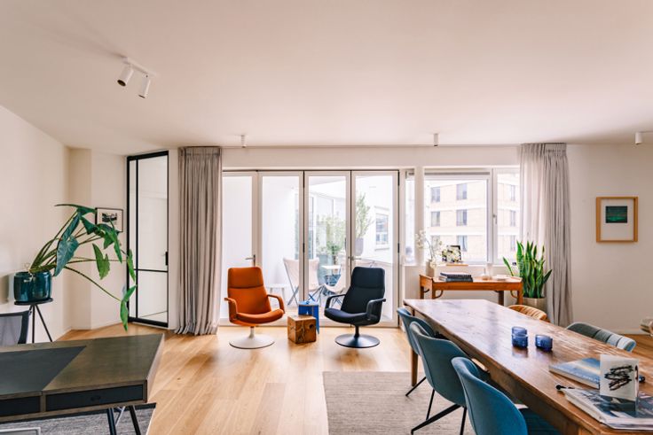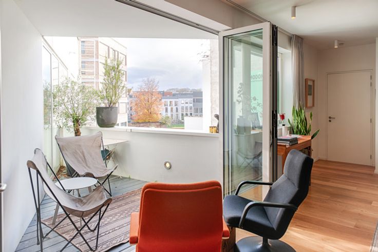 Hier woon je met zicht op twéé pleintjes: Falcon- en Paul Smeekensplein, vlakbij het historische centrum en het levendige Eilandje. Geef je smaakpapillen de kost bij Pazzo of ga voor pizza bij Otomat, en start je dag met een koffie van Yellow corner. Cultuur in het MAS, op zondag kraakverse groenten van de biologische markt of uitwaaien aan de Schelde? Hier valt altijd wat te beleven. Op de 2de verd van deze mooie, kleinschalige jongbouw uit 2015 stroomt het licht royaal binnen door de vele ramen. Op elk van de vier verdiepingen vind je één appartement. Het valt meteen op hoe superrustig het hier is: dankzij het tripelglas vooraan en optimale privacy (geen inkijk) achteraan, vormt dit echt een cocon middenin de bruisende stad. Je komt binnen in de light & airy leefruimte met open keuken, samen 62 m2. De stalen deur met glas leidt naar het bed- en badgedeelte. Daar vind je een apart toilet, twee handige bergingen, de riante bdk met ligbad en douche en drie slpkmrs. Eén van deze slpkmrs werd door de huidige eigenaars opengemaakt, maar is eenvoudig weer op te splitsen. Aan deze zijde van het app geniet je van een vrij zicht over het Paul Smeekensplein. Het slaapgedeelte heeft ramen aan beide kanten. Het zonnige, semi-inpandige terras ligt supercentraal in de woning, waardoor het zorgt voor een leuke vibe. On top of it all: een aparte fietsenberging voor elk appartement en handige toegang naar het Smeekensplein. De huurgarage vlakbij kan worden overgenomen of aangekocht.