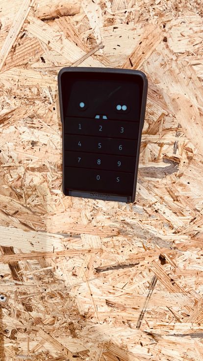 Porte principale : 3 m de hauteur x 4 m de largeur, équipée d’un clavier à code extérieur et de télécommandes fournies.