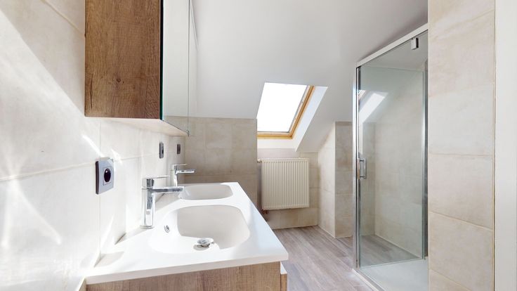 À l’intérieur, vous trouverez une salle de bain et une salle de douche, offrant fonctionnalité et confort. Le grand salon, particulièrement lumineux, constitue un espace de vie agréable et convivial.