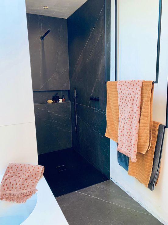 * Badkamer volledig in Corian met een italiaanse keramische tegelvloer die doorloopt in de inloopdouche en overal vola kraantjes
