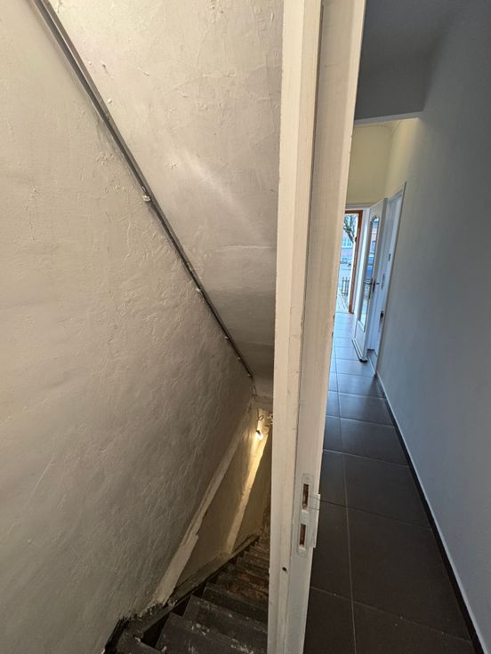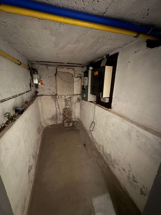 In de droge kelder bevinden zich de aansluitingen voor gas, elektriciteit, water en internet (Telenet).