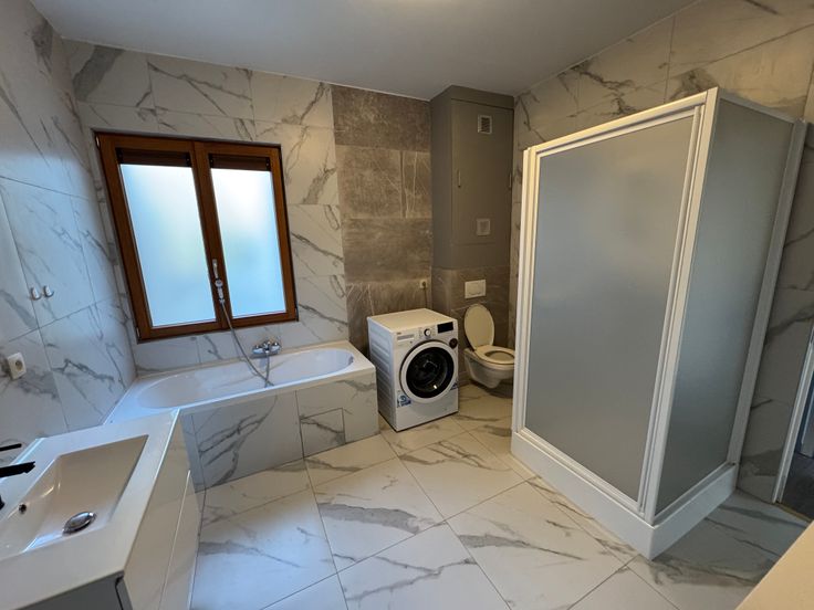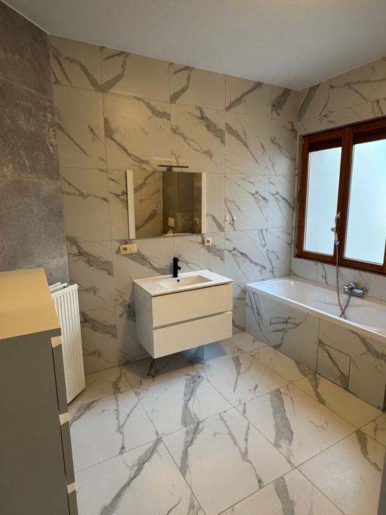 De badkamer is uitgerust met een douchecabine, bad, een enkele wastafel met spiegel, wasmachine en een toilet.