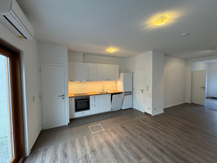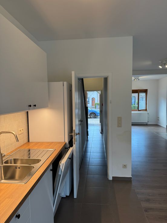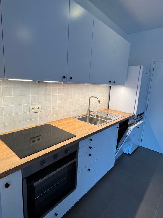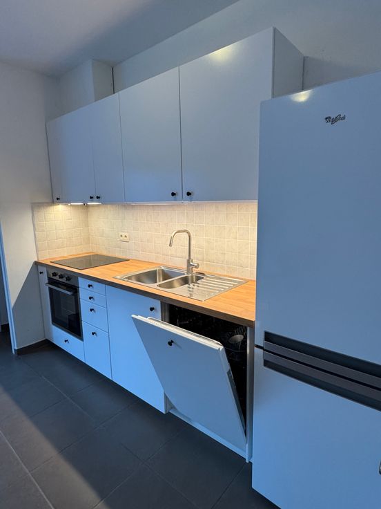 De nieuw geplaatste open keuken is voorzien van een oven, ingebouwde dampkap, inductievuur, vaatwasser, koelkast en diepvriezer.