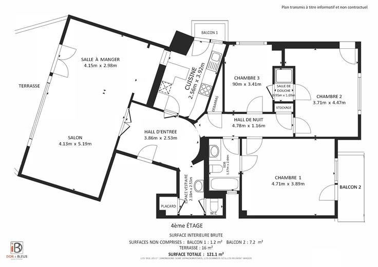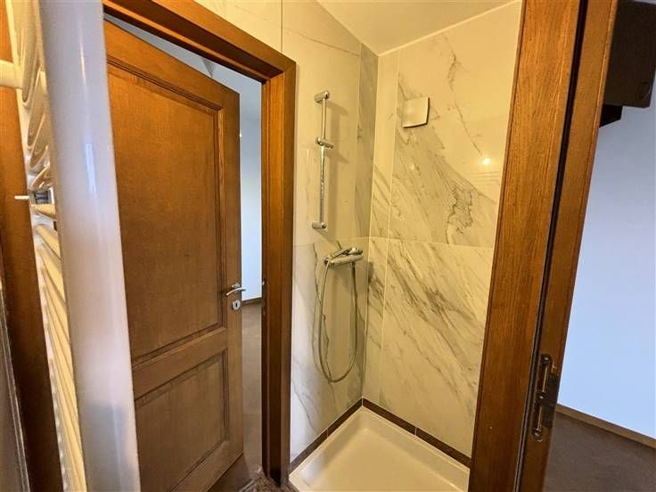 4ème ét.: hall d'entrée carrelé (+/-10 m²), 1 espace vestiaire(+/-6 m²) avec w.c., lave-mains et placard, gd séjour (+/-34 m², parquet) avec accès terrasse, cuis. éq. (+/-10 m², avec four, taque vitrocéramique, hotte, frigo, congélateur, lave-vaisselle, meubles évier et de rangement) avec accès à un balcon, hall de nuit (+/-6 m²), 3 chambres (+/-18, 17 et 10 m²) dont une suite parentale avec terrasse et accès à la sdb (+/-4 m², avec baignoire, meubles lavabo et w.c.), 1 salle de douche accès par les 2 autres chambres (+/-2m², avec douche et radiateur sèche-serviettes) .