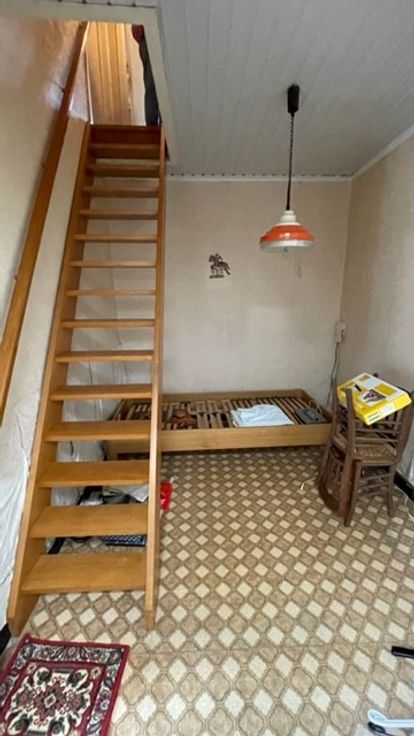 Voordeur met toegang woonkamer, afzonderlijke keuken, eetplaats, badkamer, berging/wasplaats, extra berging met trap (luik) naar verdiep. Via de keuken is er ook een trap naar het verdiep met 3 kleinere slaapkamers.