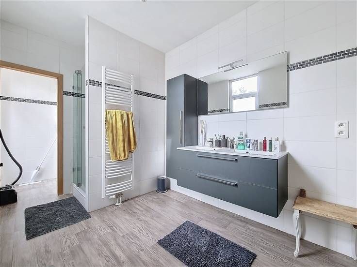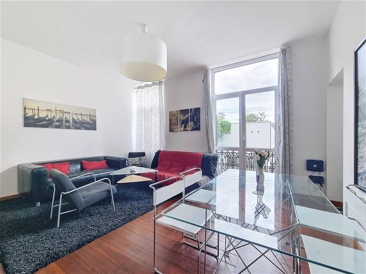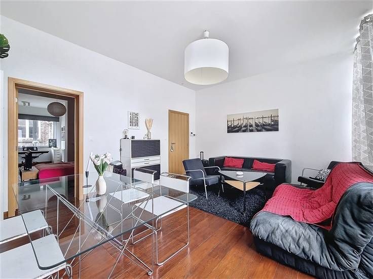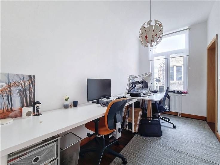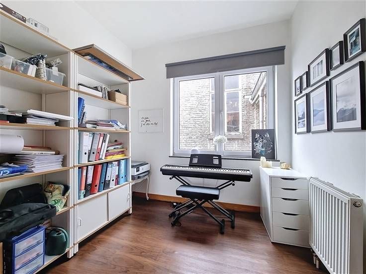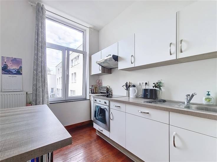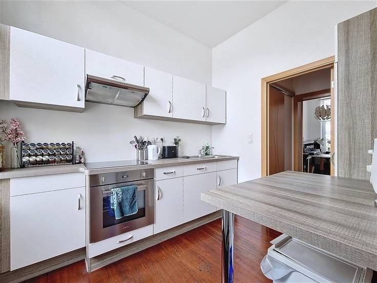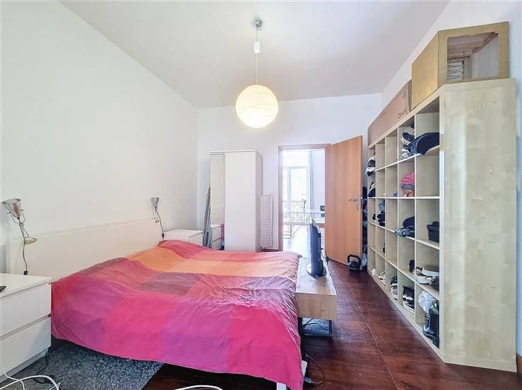 Ruim appartement op de 1e verdieping. Het bestaat uit een lichte woonkamer, een ingerichte keuken, een grote comfortabele slaapkamer, een tweede kleinere slaapkamer, een kleedkamer, een wasruimte, een badkamer en een apart toilet. De voorziening voor gemeenschappelijke lasten is €40/maand. Individuele meters.
