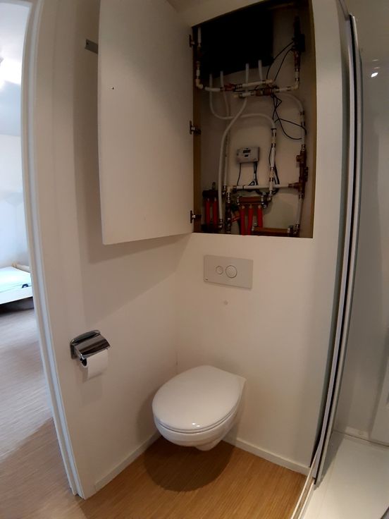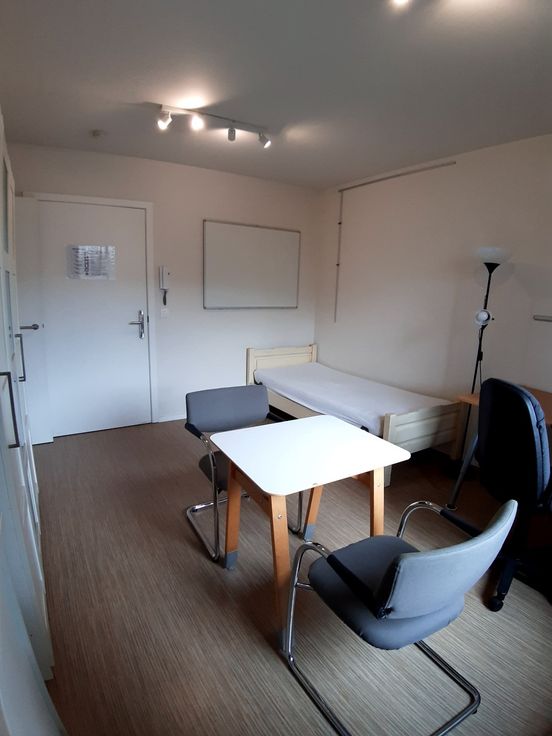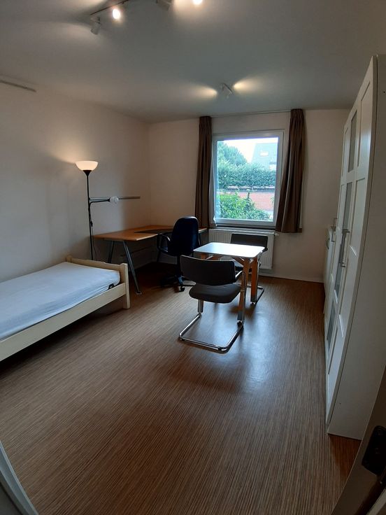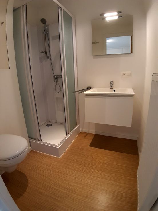 Privaat: Moderne lichtrijke kamer op het gelijkvloers met aansluitend een badkamer met toilet, lavabo en douche.