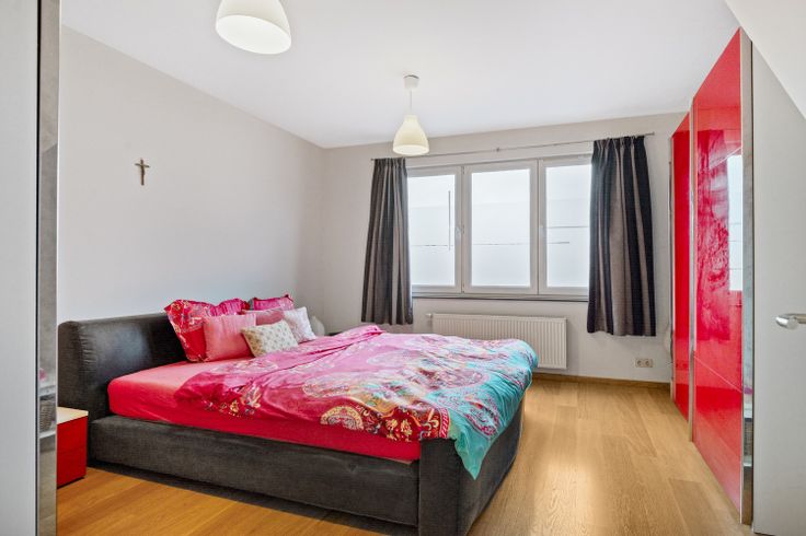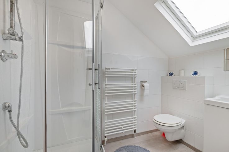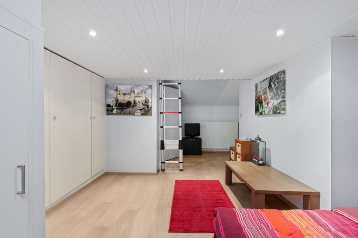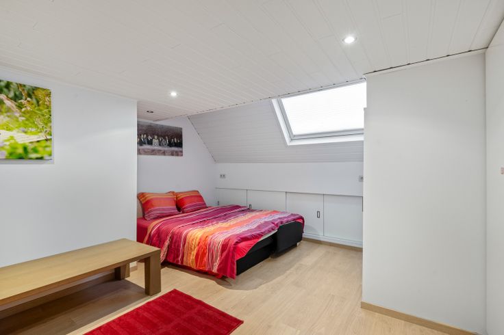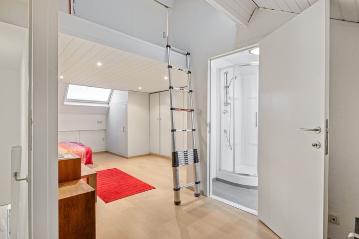 Tenslotte op de tweede verdieping is er nog één grote slaapkamer met een mezzaine, badkamer en een berging voor de omvormer van de zonnepanelen. In de tweede badkamer is er een douchecel, handoekverwarmer, lavabo in meubel en een Velux raam.