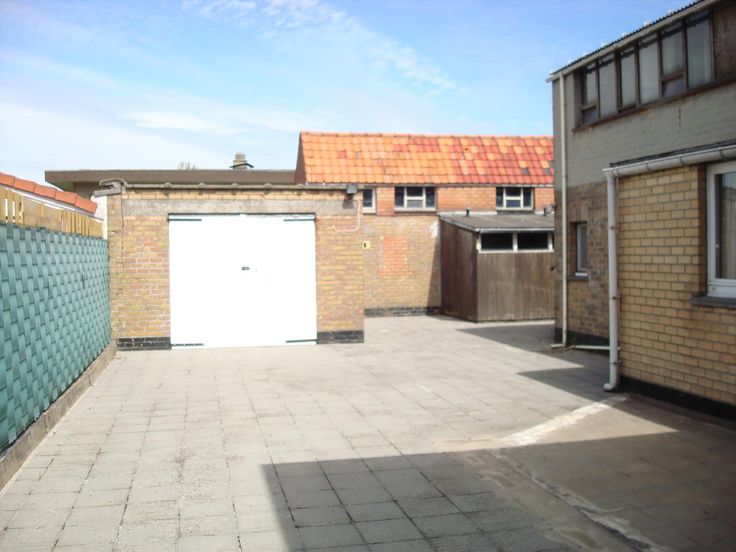 Afgesloten oprijlaan met ruime garagebox. Terras met fietsenberging en bergingen.