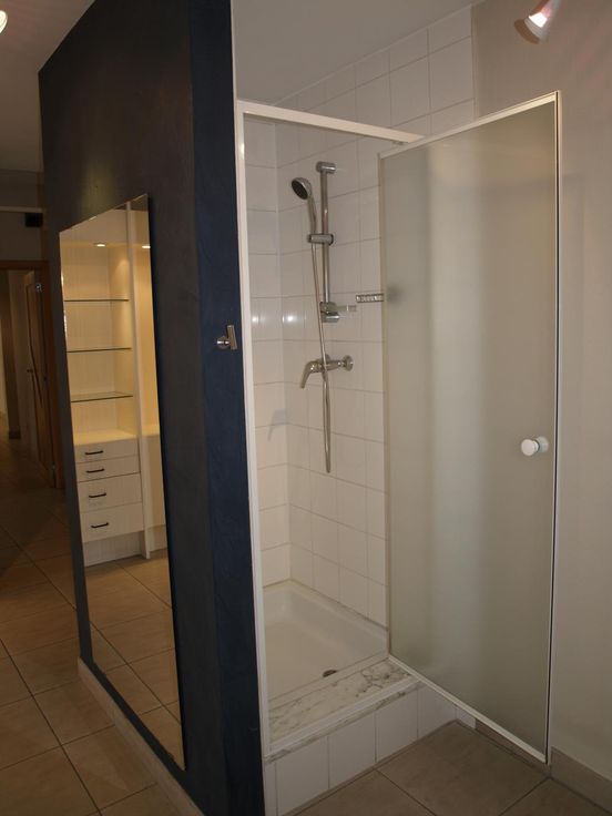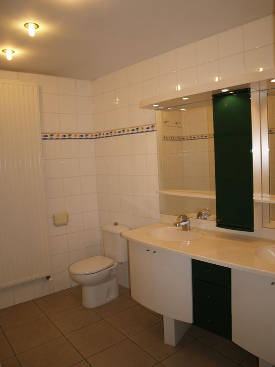 Het woongedeelte bevat een slaapkamer(25m²) + dressing (10m²) + douche, een gesloten keuken met zitplaats, een tweede slaapkamer (17m²), een badkamer met dubbel wastafel + toilet + ligbad, een woonkamer (15m²) en een koertje (7m²).