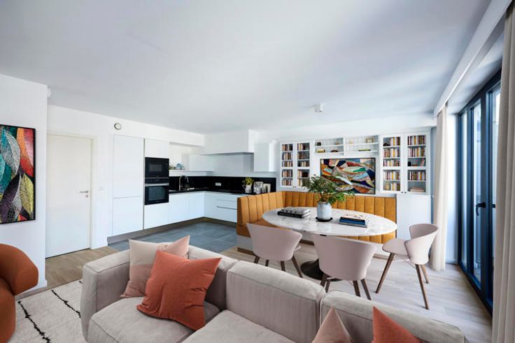 DIAMANT - Bathim & Co offers you this superb 2 bedroom apartment of 86m2 with new terrace (subject to the 21% VAT regime) located in Schaerbeek, only 150 meters from Woluwe-St-Pierre and Woluwe-St-Lambert, in Etterbeek between Diamant, Montgomery and Merode. This crossing apartment is composed as follows: An entrance hall with built-in cupboards and guest toilet, a large living / dining room area, a fully equipped open kitchen, a beautiful and large terrace of +- 24m2, a night hall serving two separate bedrooms, each with access to a balcony, a bathroom, a toilet, a laundry area. The apartment is part of a property, which was once two large individual townhouses from the beginning of the 20th century, and which has undergone a major renovation program. The apartment now offers a spacious and luxurious space with high ceilings, wide halls and state-of-the-art materials, installations and equipment, as well as the best energy performance levels in its category. With fully insulated facades, fully sealed windows, anti-vibration acoustic partitions, triple-glazed aluminum windows (thermal and acoustic), and a silent and fast Schindler elevator, the building has been renovated in compliance with the most advanced environmental standards. The apartment has individual water and electricity meters, a videophone system and an alarm system. Fiber optics, cable and ethernet are also available. Each parking space (which are optional at 30,000 euros) is equipped with the necessary wiri