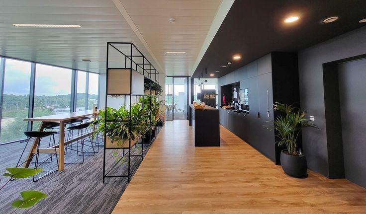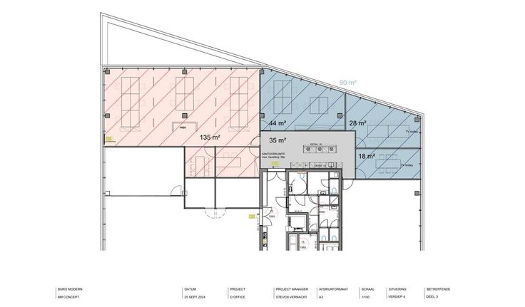 indeling: 135m² gemeubelde kantoorruimte (links: 16 wp) + 90m² gemeubelde kantoorruimte (rechts: 6 wp) met 35m² gemeenschappelijke keuken uitgerust met 2 vaatwassers, 2 microgolfovens, 2 frigo's en spoelbak