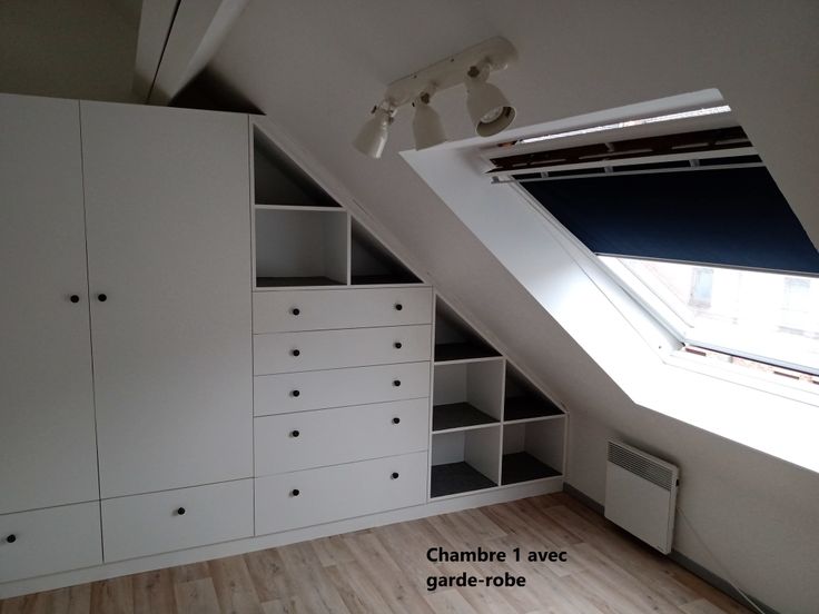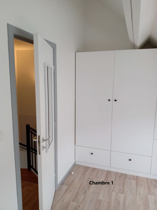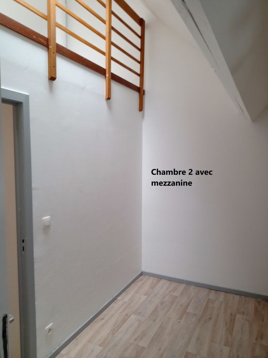 - de deux chambres. L'une est équipée d'une mezzanine (place pour y mettre un lit simple supplémentaire), l'autre possède une garde-robe sur mesure.