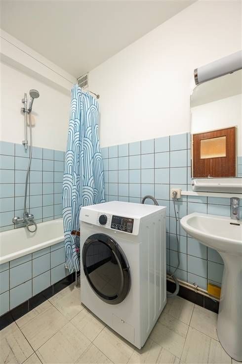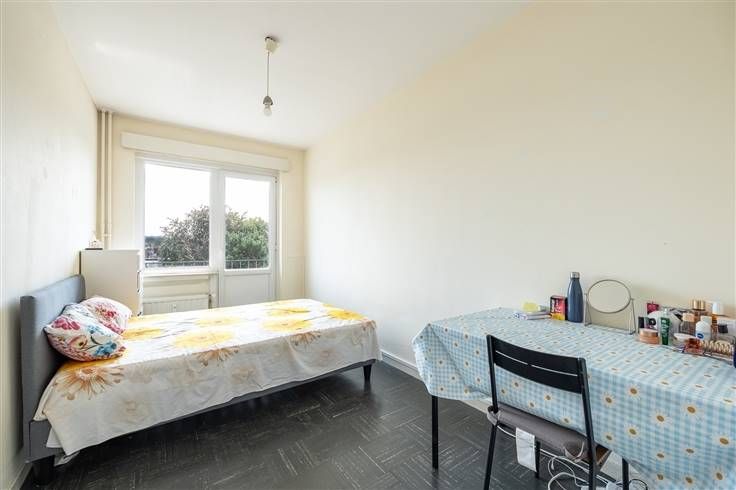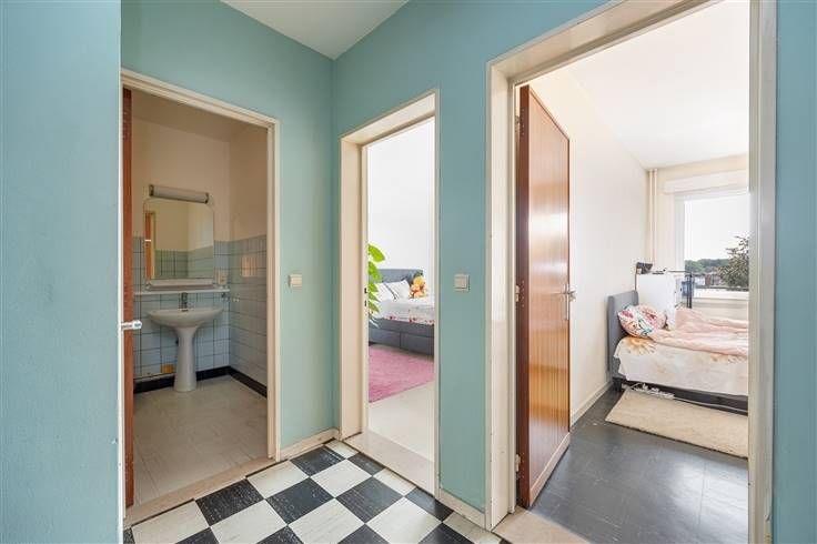 Weer in de hal, heb je naast het toilet nog een betegelde badkamer met lichtblauwe retrotegeltjes tegen de muur en een witte vloertegel. Voorzien van een ligbad met douchekop, lavabo, spiegel en aansluiting voor was en droog. De twee slaapkamers bevinden zich achteraan en zijn met 12 en 17,5 m² allebei lekker ruim en licht, met vliegenramen en automatische rolluiken. De kleinste slaapkamer geeft toegang tot het tweede, ruime, zonnige terras, dat de hele breedte van de twee slaapkamers beslaat. Je hebt hier dus zeker plaats genoeg voor een tafeltje met twee stoelen om te genieten van het weidse, open uitzicht van hier op vier hoog.