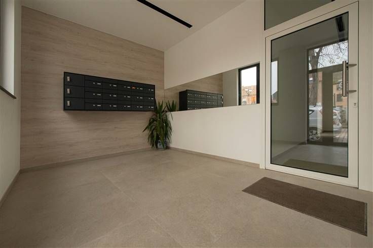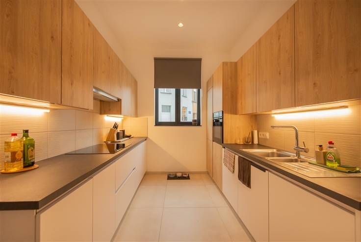 Nieuw appartement op gelijkvloers met 2 slaapkamers, terras en staanplaats in een ondergrondse garage, gelegen in het centrum van Halle: inkomhall, ruime living met open, volledig ingerichte keuken, aparte berging, 2 slaapkamers, terras aan achterkant van het gebouw