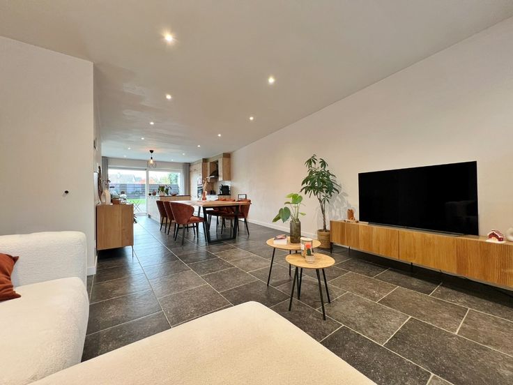 Bij binnenkomst wordt u verwelkomd in een inkomhal met gastentoilet. Aan de rechterzijde treft u via een glazen deur de ruime woonkamer opgedeeld in een gezellige zitruimte en eetplaats met aansluitend een open volledig ingerichte keuken met extra leeshoek/speelhoek en zicht over en toegang tot de tuin. Aansluitend tref je hier ook een ruime bergruimte. Via de keuken heb je tevens toegang tot de traphal zo komen we op het eerste verdiep waar we drie ruime slaapkamers terugvinden, een ruime moderne badkamer voorzien van inloopdouche, bad, dubbel lavabomeubel, hal met ruimte voor ingemaakte kast en een apart toilet. Op het tweede verdiep ( bereikbaar via vaste trap ) vinden we nog twee slaapkamers, een badkamer met douche en lavabomeubel en een ruimte bergruimte terug, hier is er tevens toegang tot de zolder via een zolderluik.