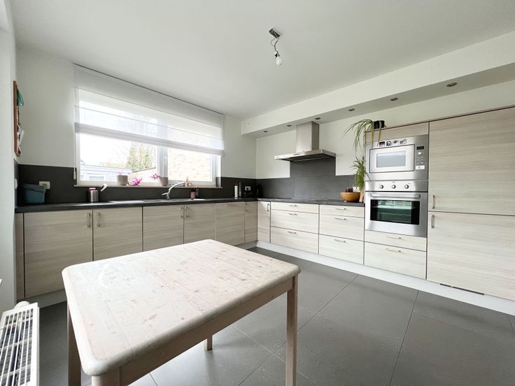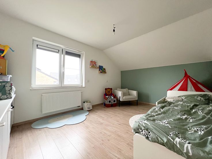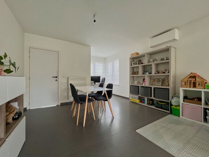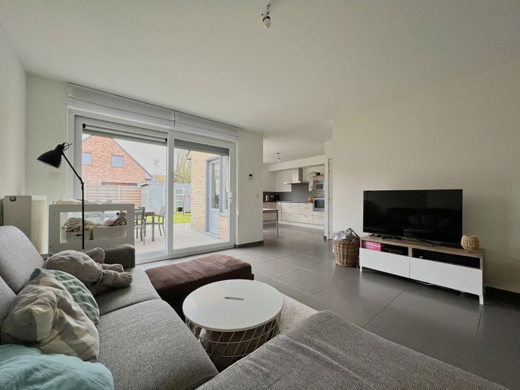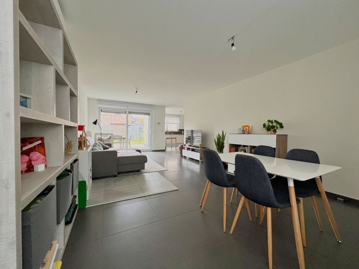 We treden de woning binnen via de inkomhal met gastentoilet. De inkomhal biedt rechtstreeks toegang tot de lichtrijke en ruime woonkamer, bestaande uit een zithoek en een eethoek. Aansluitend bevindt zich de open keuken, uitgerust met een dampkap,kookplaat, microgolfoven, oven, vaatwas, spoelbak, koelkast + ingemaakte kasten. De keuken én woonkamer verlenen tevens directe toegang tot de tuin. Aansluitend aan de keuken, treffen we een praktische berging/wasplaats + inpandige garage.