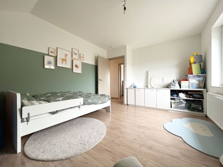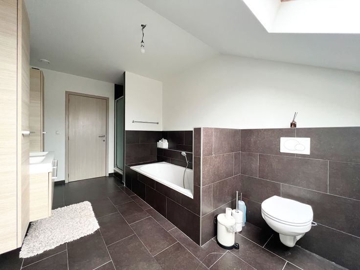 Via de trap in de inkom, bereiken we het eerste verdiep. Op de eerste verdieping bevinden er zich drie ruime slaapkamers én een ingerichte badkamer (lavabomeubel, ligbad + douche + toilet). Het eerste verdiep biedt tevens toegang tot het zolderverdiep, via een valtrap.
