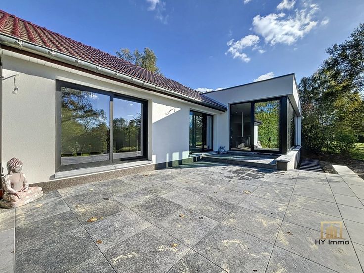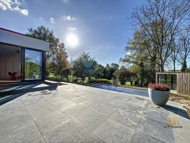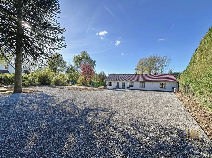 VILLA entièrement rénovée en 2024 avec matériaux de qualités composée de 2 grandes chambres (possibilité 3ème chambres) + espace bureau, spacieuse terrasse arrière avec piscine extérieure chauffée + aire de parking sur TERRAIN DE +/- 23ares.