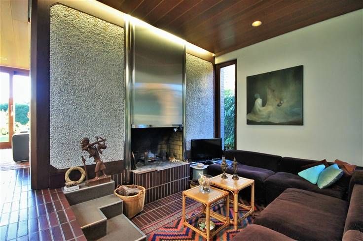 Un salon cocooning en contrebas est présent et agrémenté par un feu ouvert, une cuisine toute équipée avec coin repas comprenant : lave-vaisselle, four, taque, hotte, frigo.