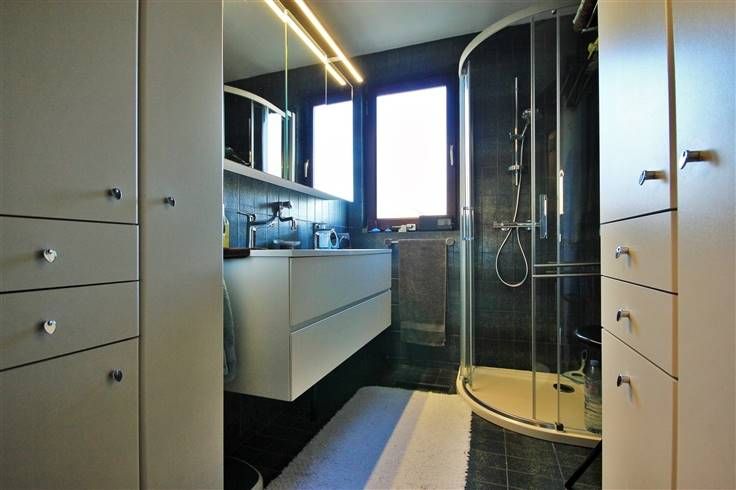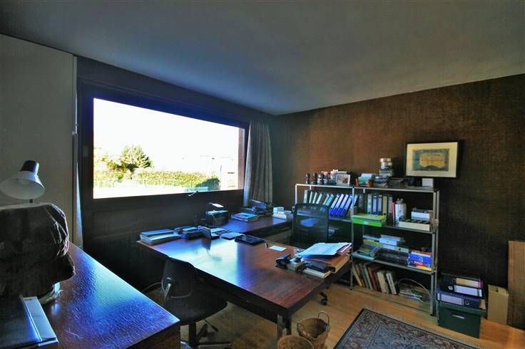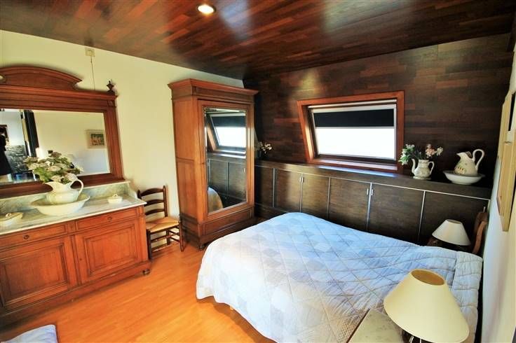 Via le hall d’entrée, une porte dissimulée à coté de rangement, type vestiaire, permet l’accès à un espace nuit aménagé actuellement en chambre, salle de douche meublée et équipée, WC séparé et bureau.