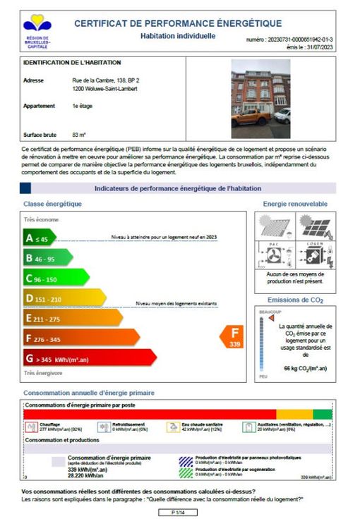 : Total énergie primaire: 28220 kwh/an, EPC certificaat nb., : 66 Kg Co2m²an, : 339 Kwh