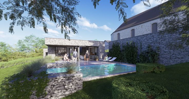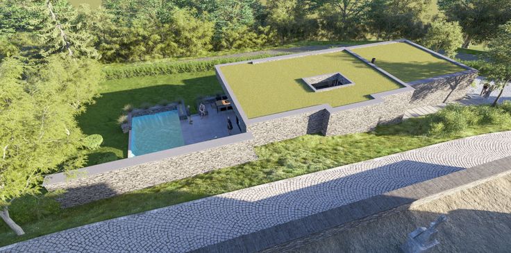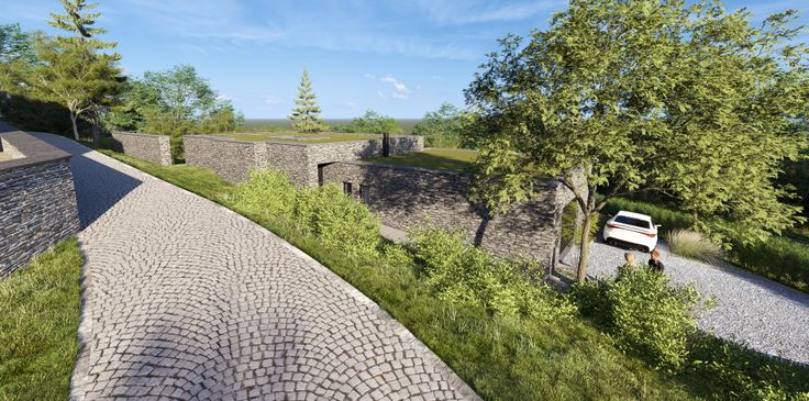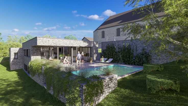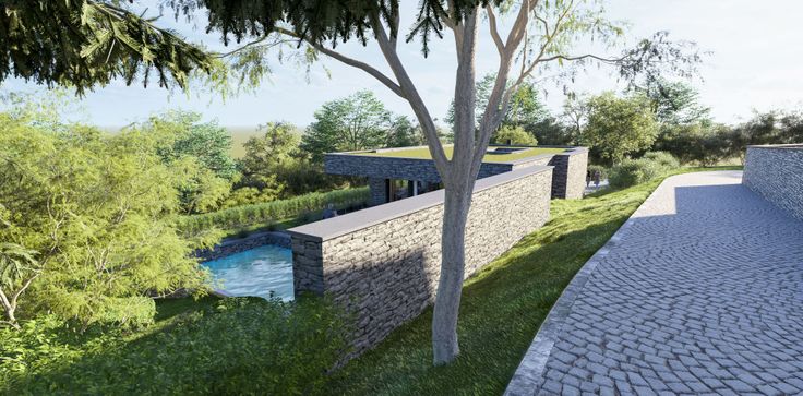 L'habitation est prévue en pierre du pays et toiture plate végétalisée et comporte quatre chambres, possédant chacune un coin sanitaire.