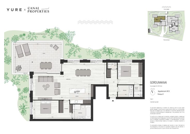 Doordat het gelijkvloers ca. 1m is verhoogd ten opzichte van het straatniveau heb je vanop het ruime hoekterras zicht in de lengte over het prachtige water aan de Gordunakaai. Verder is dit westgerichte terras volledig omringd door de weelderig (winter)groen aangelegde tuin, waardoor privacy gegarandeerd is.