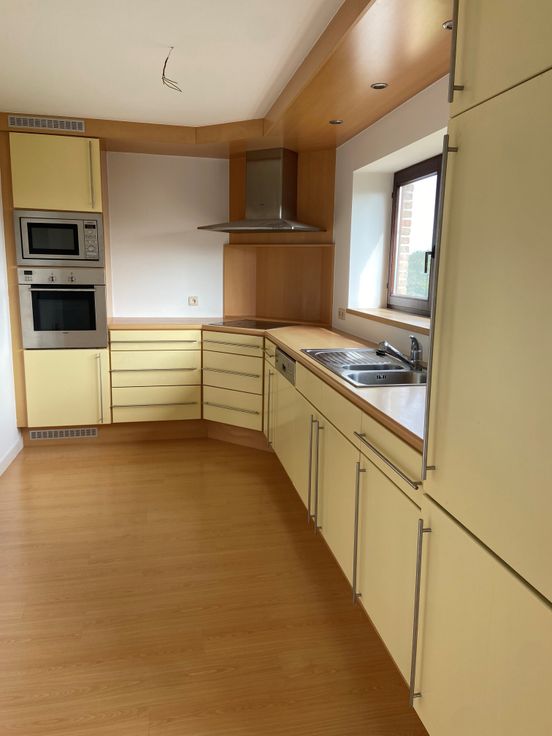 De inkomhal is op de gelijkvloers (geen gemeenschappelijke delen). Er is een lichtrijke leefruimte met volledig geïnstalleerde keuken. Verder beschikt het appartement over twee aparte toiletten, een badkamer, 3 slaapkamers (mogelijkheid om hier 5 slaapkamers van te maken) en twee bergingen. Eigen oprit met voldoende parking !