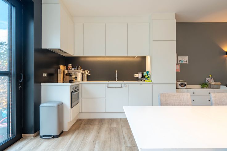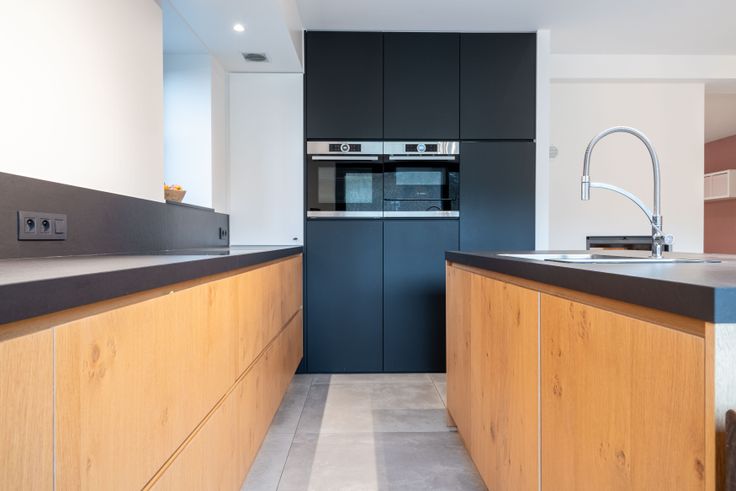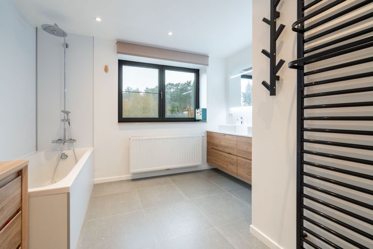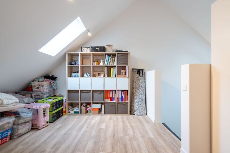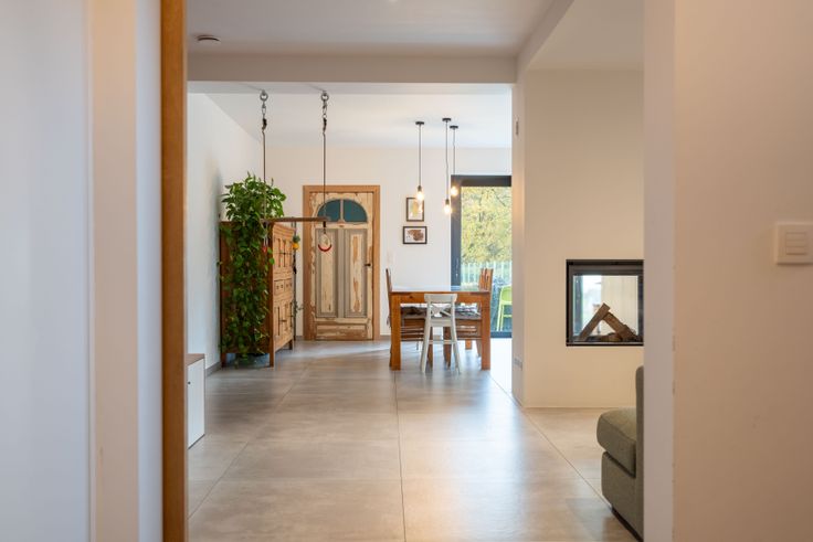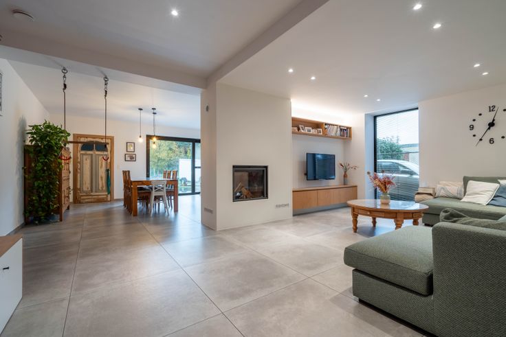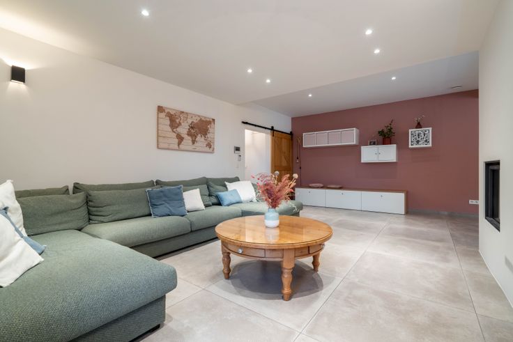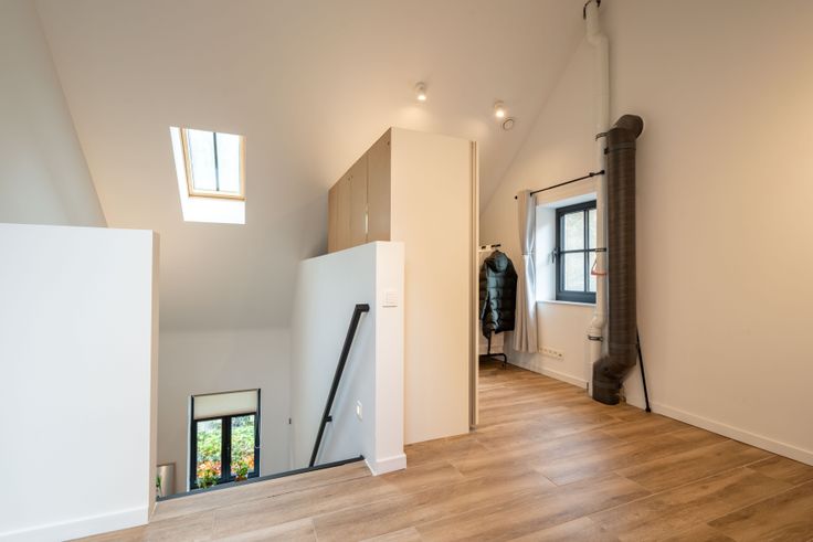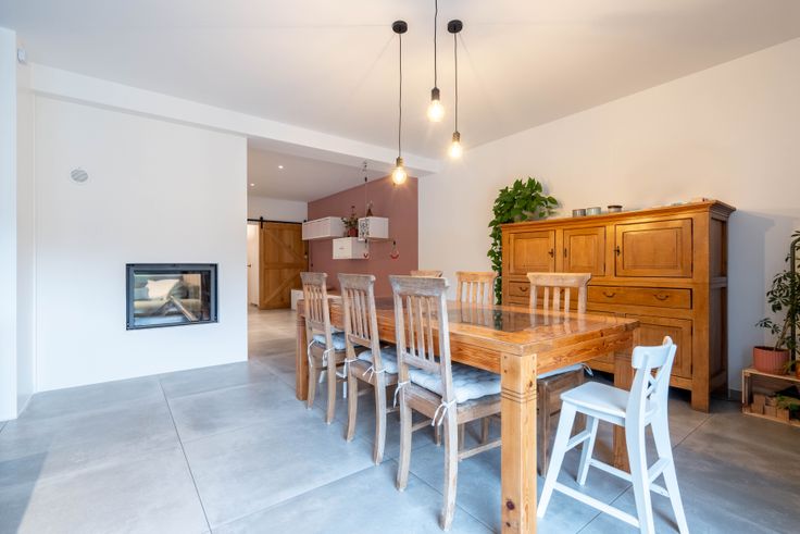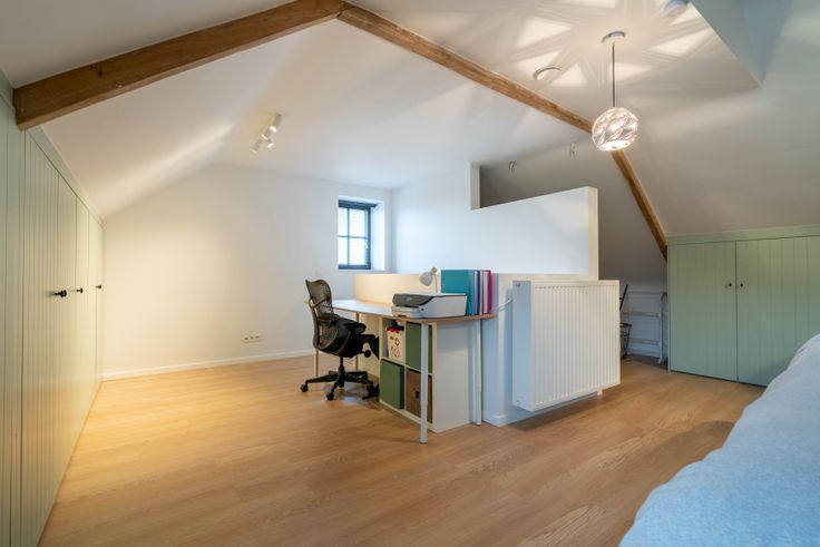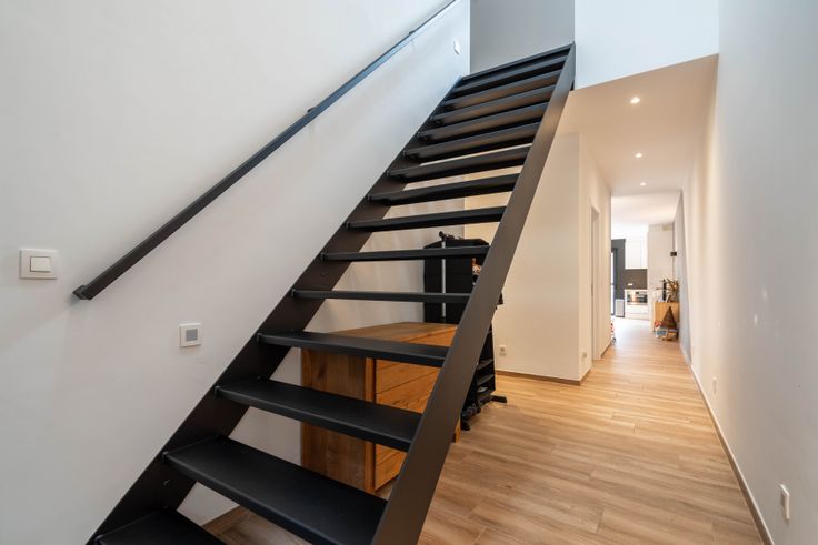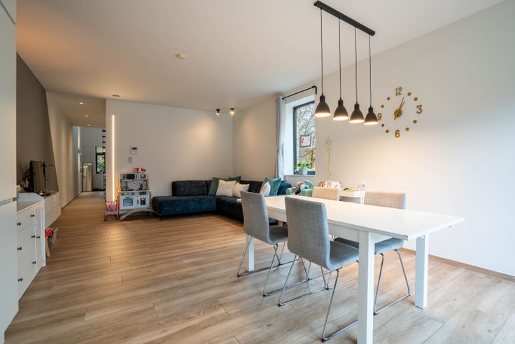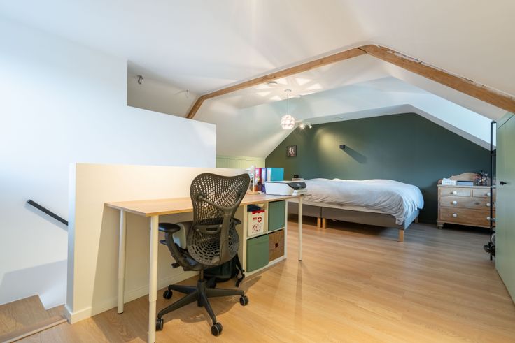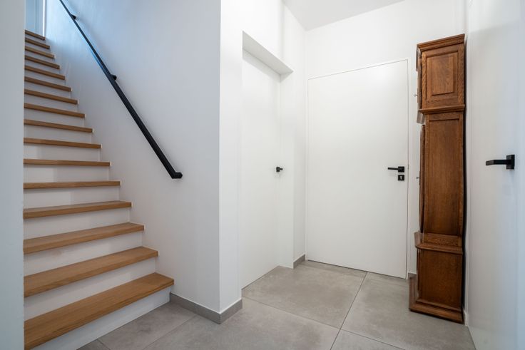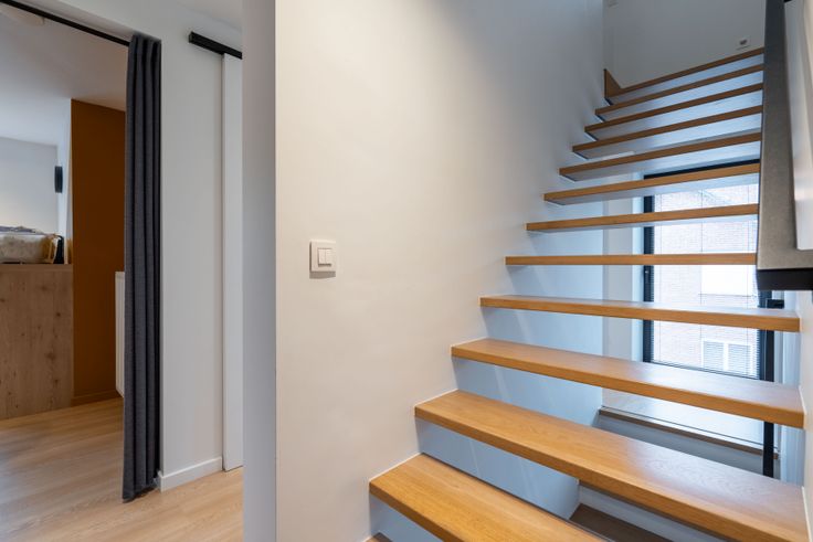 Via de gemeenschappelijke hal kom je in een doorloophal met wc, berging/wasplaats en eiken trap. De lichtrijke living met doorkijkhaard en open keuken (eiken kasten, dekton blad) geeft een loftgevoel. Achteraan: hal naar zonneterras en tuin. Boven: 2 ruime slaapkamers, volledig ingebouwde bureauruimte, wc en badkamer (ligbad, 2 lavabo’s). Op de 2e verdieping: masterbedroom met inbouw-dressing en ensuite douche.