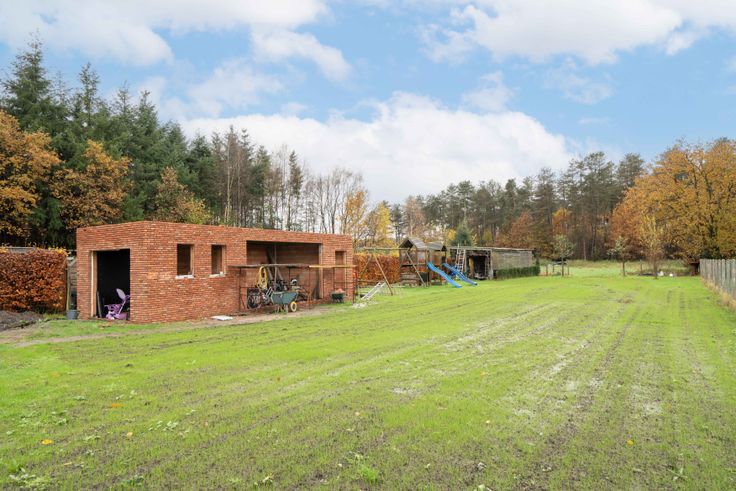 Ruime oprit, parkeergelegenheid aan beide zijden. Zuidgerichte tuin (15 are), poolhouse (af te werken), overdekte tuinberging, en zicht op agrarisch gebied.