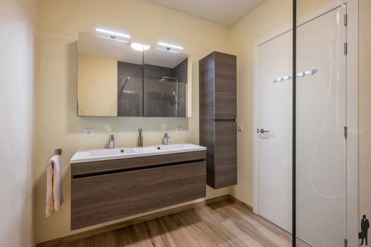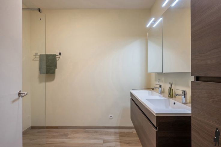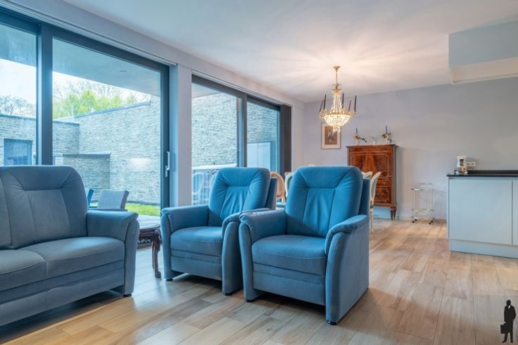 Instapklaar gelijkvloers appartement in het centrum van Brasschaat! Indeling: - Inkom met apart toilet en handwasser. - Ruime leefruimte ca. 42,4 m²), met open leefkeuken volledig geïnstalleerd (toestellen merk Siemens: Koelkast, vriezer, combi-oven, inductie kookvuur, vaatwasser en wijnkoelkast van het merk Liebherr). - Via het kamerbrede schuifraam heeft u directe toegang tot de tuin, die rechtstreeks toegang heeft tot bovengrondse garagebox (met automatische toegangspoort). - Aparte berging (ca. 4m²) met aansluiting wasmachine en droger. - Aan de voorzijde van het appartement bevinden zich 2 (slaap)kamers (ca.13,1m² - 13,5m²) - De grote slaapkamer is voorzien van een aparte dressingruimte (ca. 4,99m²). - Badkamer (ca. 5,77m²), uitgerust met een dubbel lavabomeubel en inloopdouche. Algemeen: - Zeer centraal gelegen met alle faciliteiten o.a. bakkers, slagers, supermarkten op wandelafstand. - Het is een zeer recent gebouw anno 2016. - Alle ramen zijn voorzien van geluidswerend glas en aan de voorzijde uitgerust met automatische rolluiken. -Volledig voorzien van vloerverwarming. - Aparte meters voor water, gas en elektriciteit. - Lage algemene onkosten 130 euro/ maand. - Het appartement is rolstoel toegankelijk. - Bovengrondse garagebox (toegankelijk via de Door Verstraetelei) verplicht mee aan te kopen aan 25.000 euro.