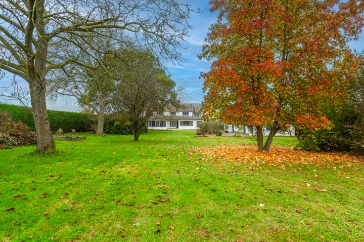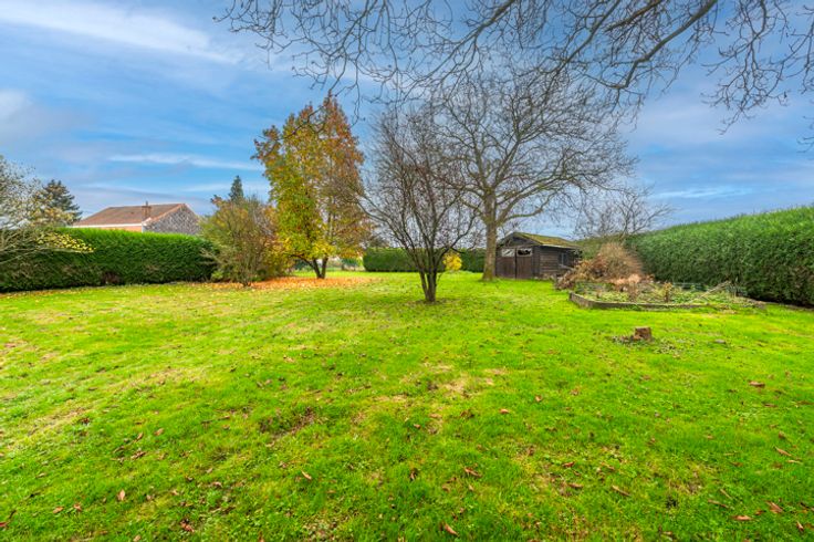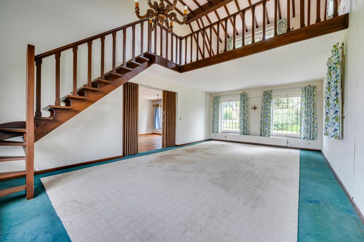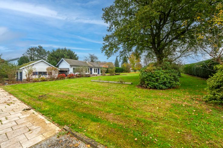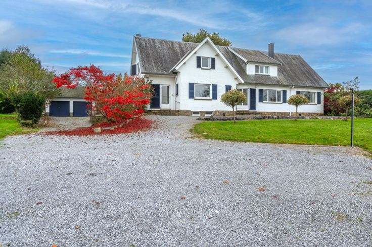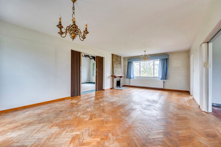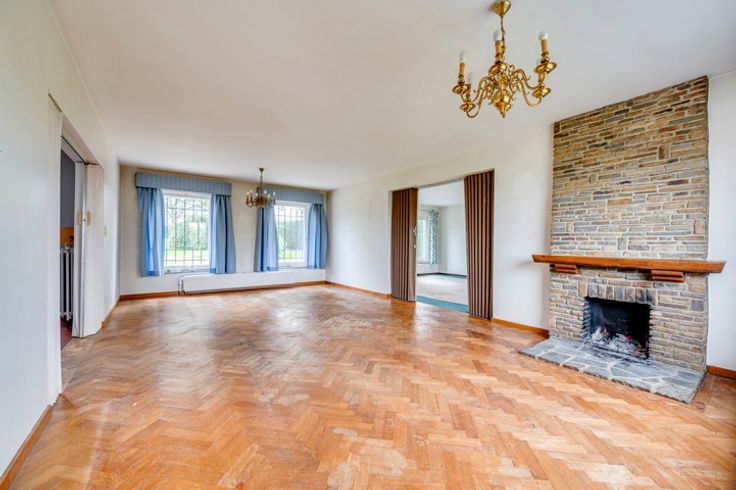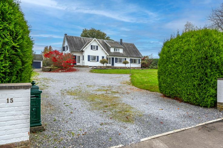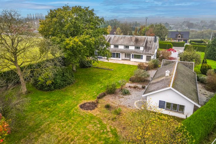 Exterieur: Imposant boomrijk perceel, beschut tegen inkijk, van meer dan 4000m² met een prachtig goed georiënteerde tuin op het zuidoosten, omgeven door haagbeplanting. Aan de voorkant een imposante grindlaan die leidt naar de woning, de 3 garages en het bijgebouw, evenals vele parkeerplaatsen.