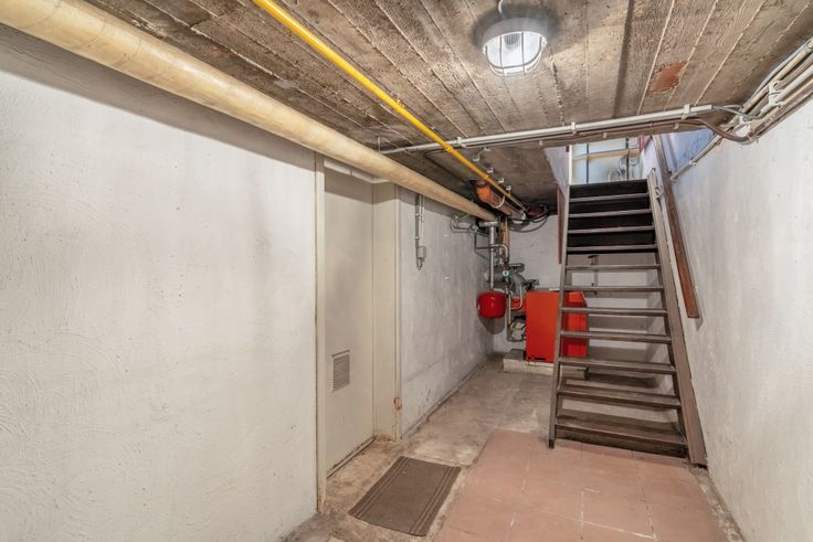 Via de voordeur betreden we de inkomhal, waar zich ook de trap naar boven bevindt. Links komen we in de woonkamer terecht met aansluitend de keuken. Deze geeft ook toegang tot de kelder, handig als koele berging.