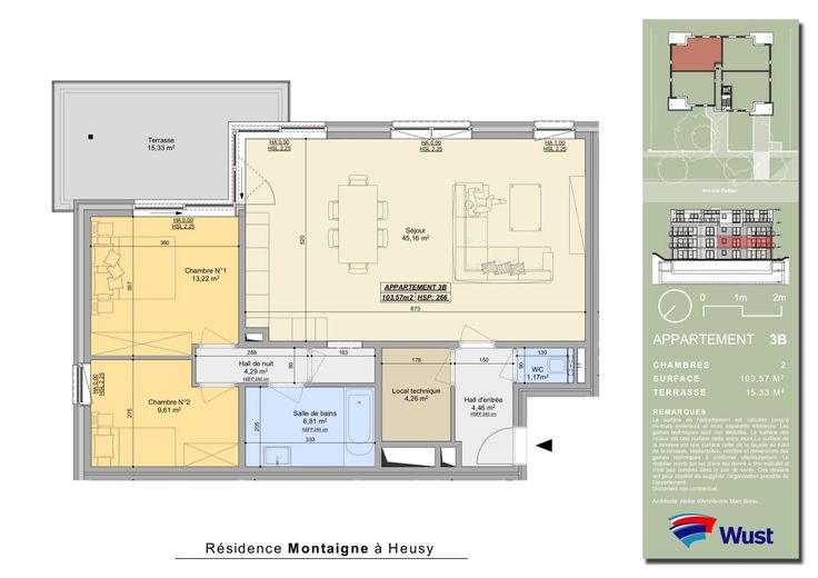 Appartement situé au 3ème étage à l'arrière gauche de la résidence. Il se compose d'un hall d'entrée, wc, 2 chàc, une sdb, grand séjour avec terrasse, cuisine non équipée, buanderie. Prix hors cave (5.500 euro)et garage (18.000 euro). Ces prix s'entendent hors frais (frais de notaire, TVA, raccordements et acte de base). Nos offres sont faites sous réserve d’erreurs, omissions, changement de prix, vente préalable ou retrait. Les superficies et dimensions mentionnées sont données à titre informatif