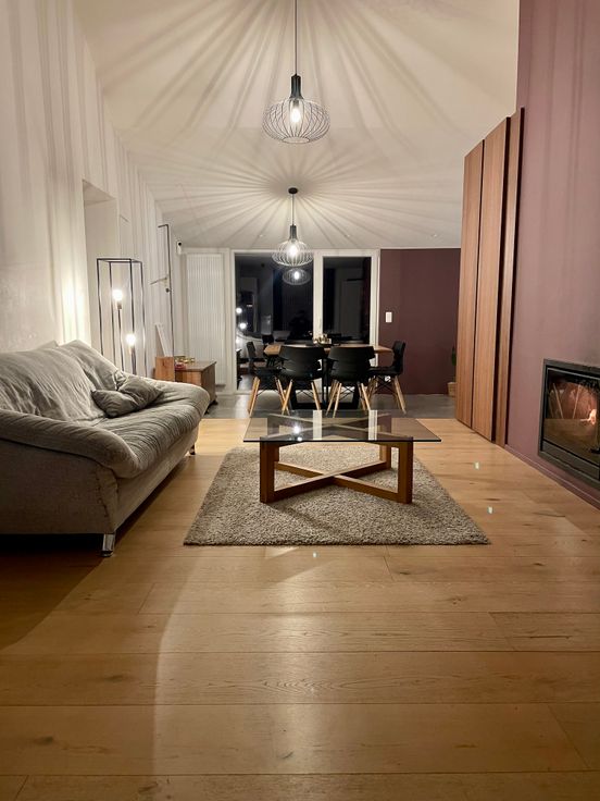 Espaces de vie : Grand séjour salon, salle à manger et cuisine ouverte.