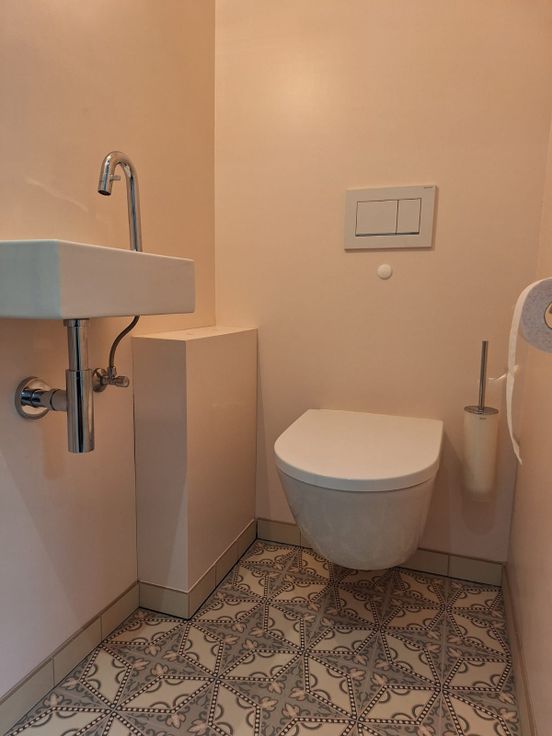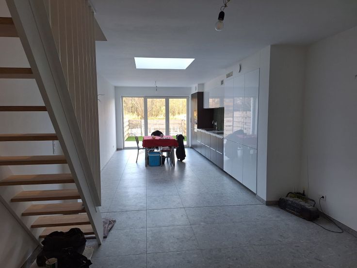 Je betreed de woning in de inkomhal / berging met aparte WC en loopt dan door naar de ruime, lichte woonkamer met volledig ingerichte, open keuken met zicht op de tuin en het achterliggende bos.