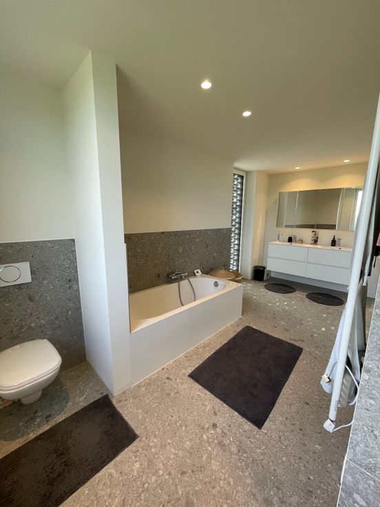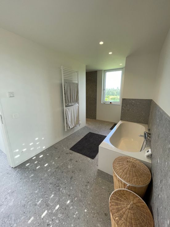 De eerste verdieping biedt plaats aan 3 slaapkamers, en 1 ruime badkamer, met dubbele lavabo, douche, ligbad en toilet.