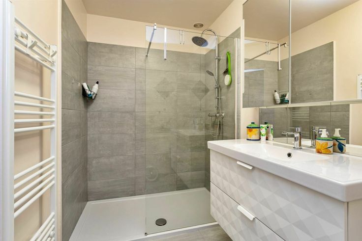 Badkamer: Moderne badkamer met inloopdouche en wastafel.