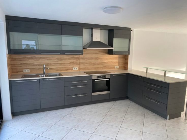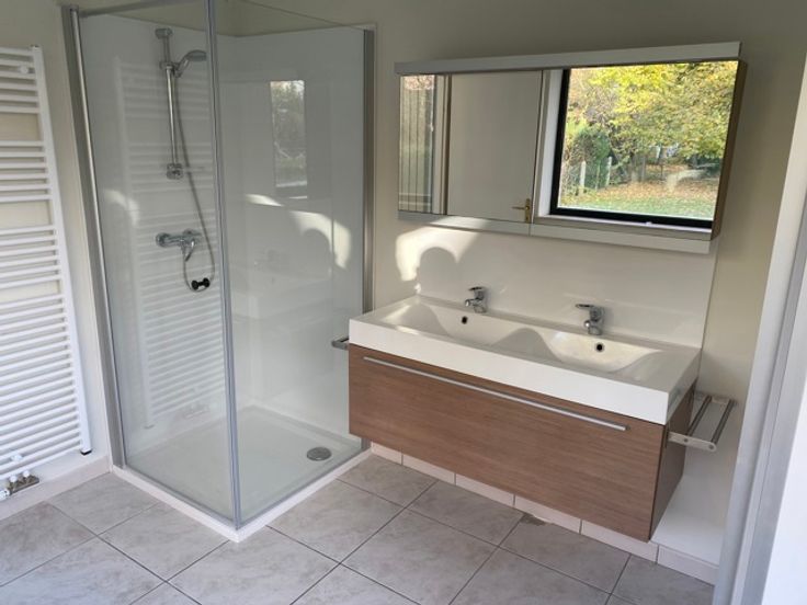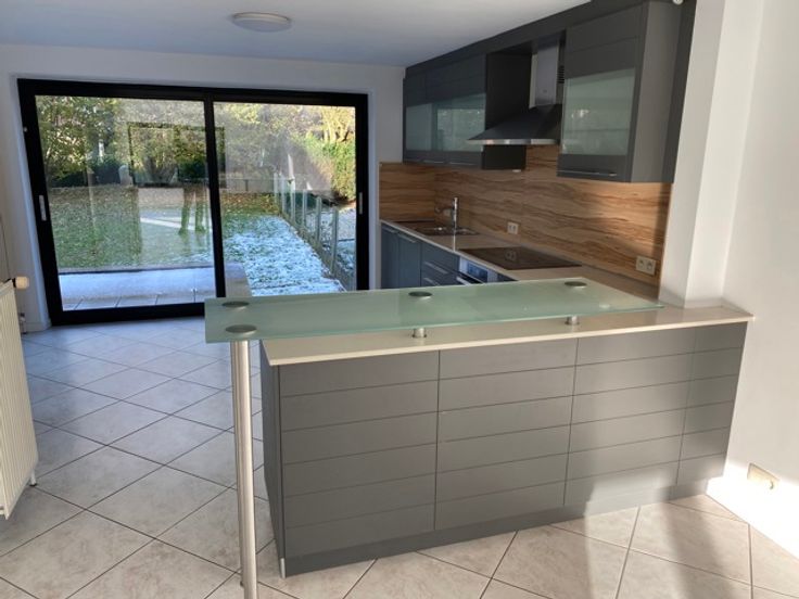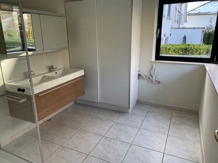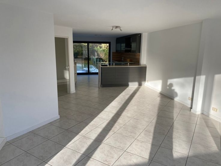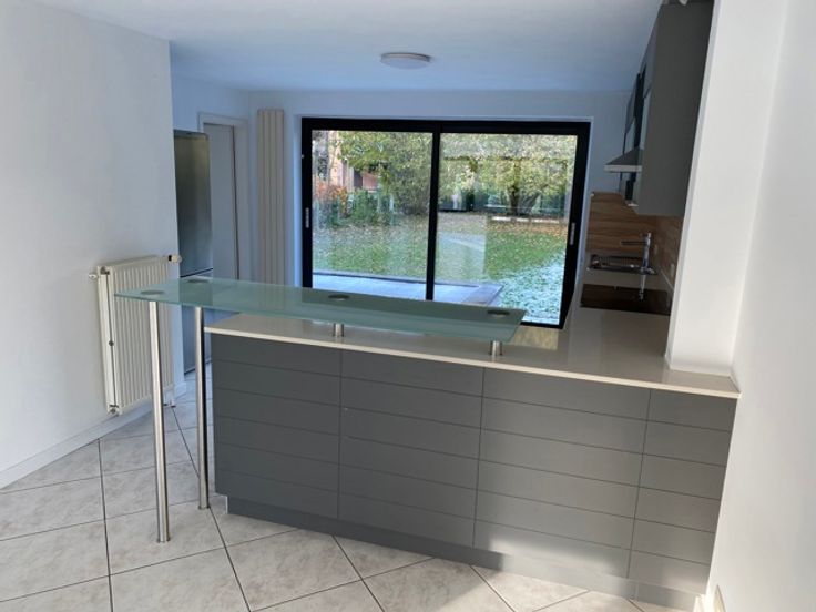 Niveau tuin: Inkomhal, WC, ruime living met open volledig ingerichte keuken, terras en tuin. Slaaphoek en badkamer voorzien van douche en dubbele lavabo.