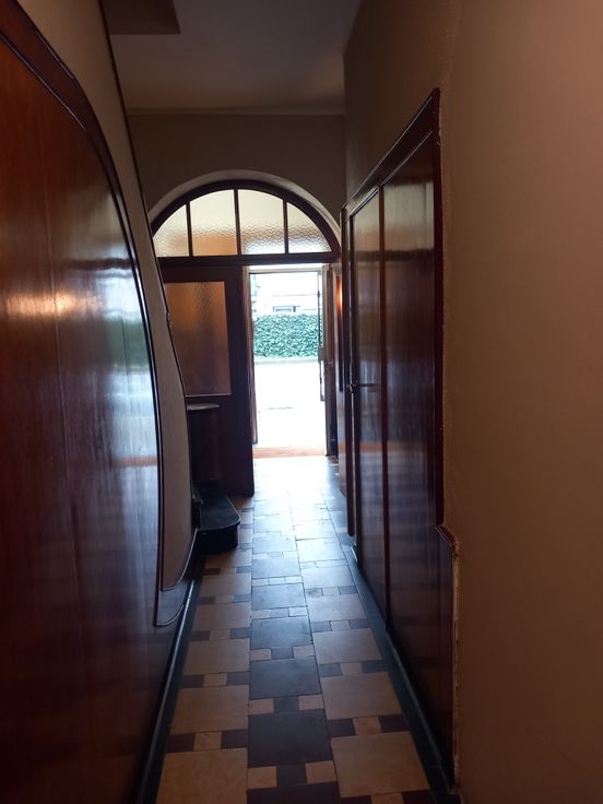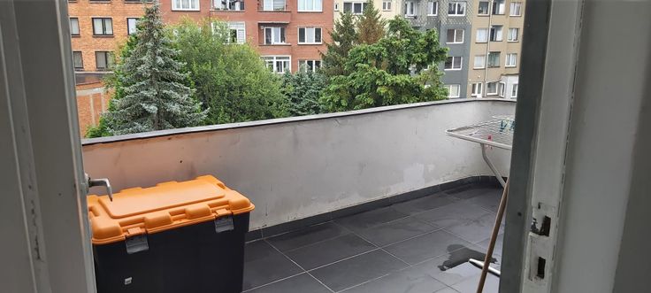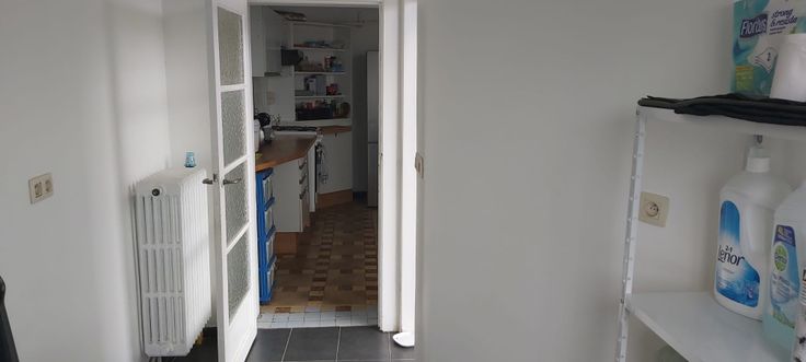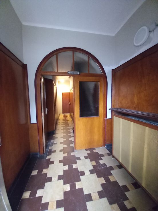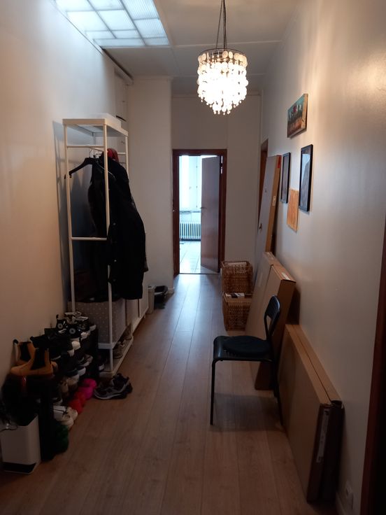 un vaste hall d'entrée avec placard de rangement, un séjour salon salle à manger de +- 25 m², 2 chambres ou 1 chambre + 1 grand bureau (de 16 m2 et 14m2), une cuisine semi équipée de 13 m² (taque gaz, hotte, four, évier) donnant accès à une buanderie de 10 m2 et à une terrasse de 10m2 avec vue dégagée sur les jardins. Une lumineuse et spacieuse salle de bains avec baignoire, des toilettes séparées et une grande cave.